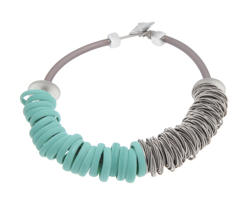 Kurze Kette aus einem Kautschukstrang mit aneinandergereiten Edelstahl- und Muranoglasringchen, begrenzt durch zwei Muranoglasplättchen und einem Knebelverschluss.