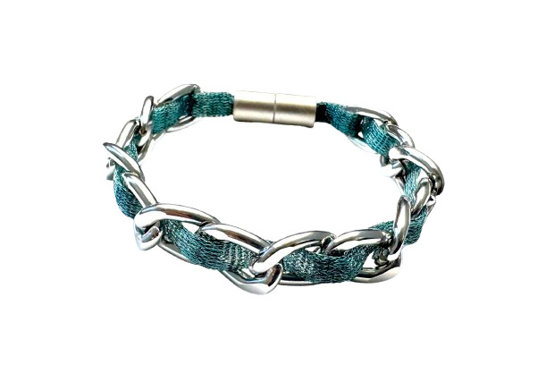 Armband aus einen Perlonschlauch durchgefädelt durch eine Gliederkette aus Aluminium mit einem Zylindermagnetverschluss.